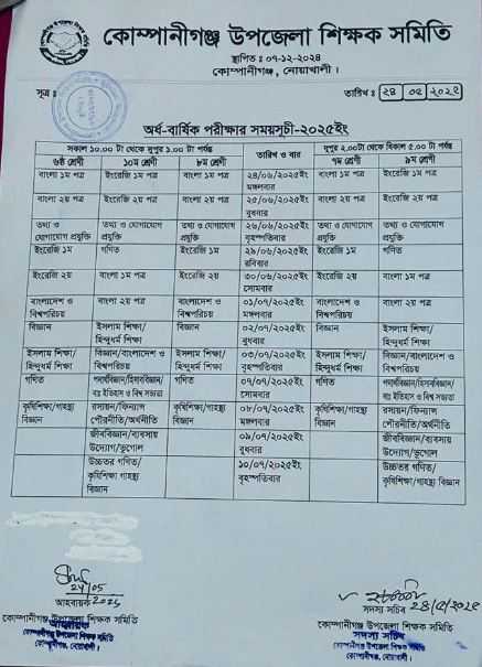 অর্ধ বার্ষিক পরীক্ষার সময় সূচী ২০২৫